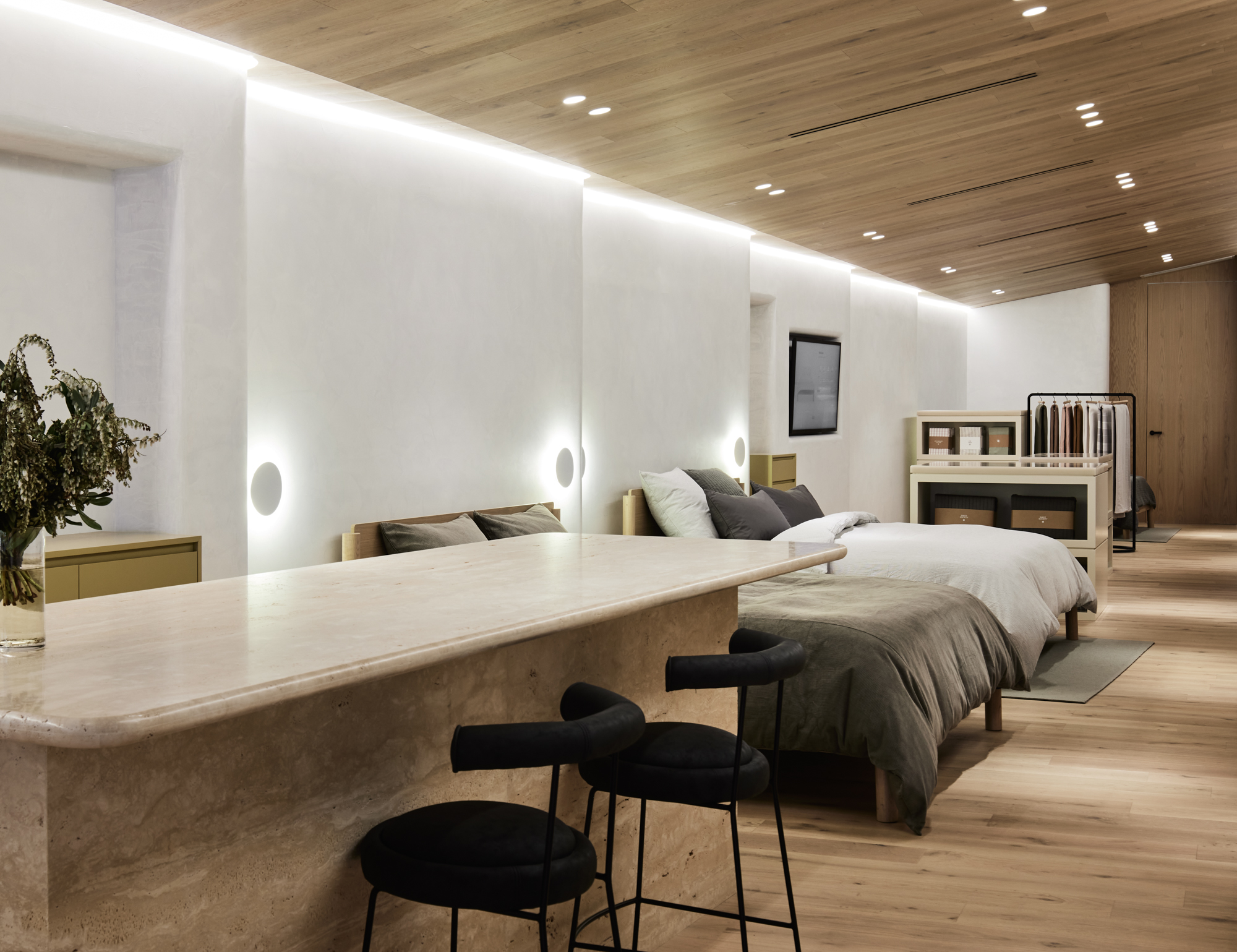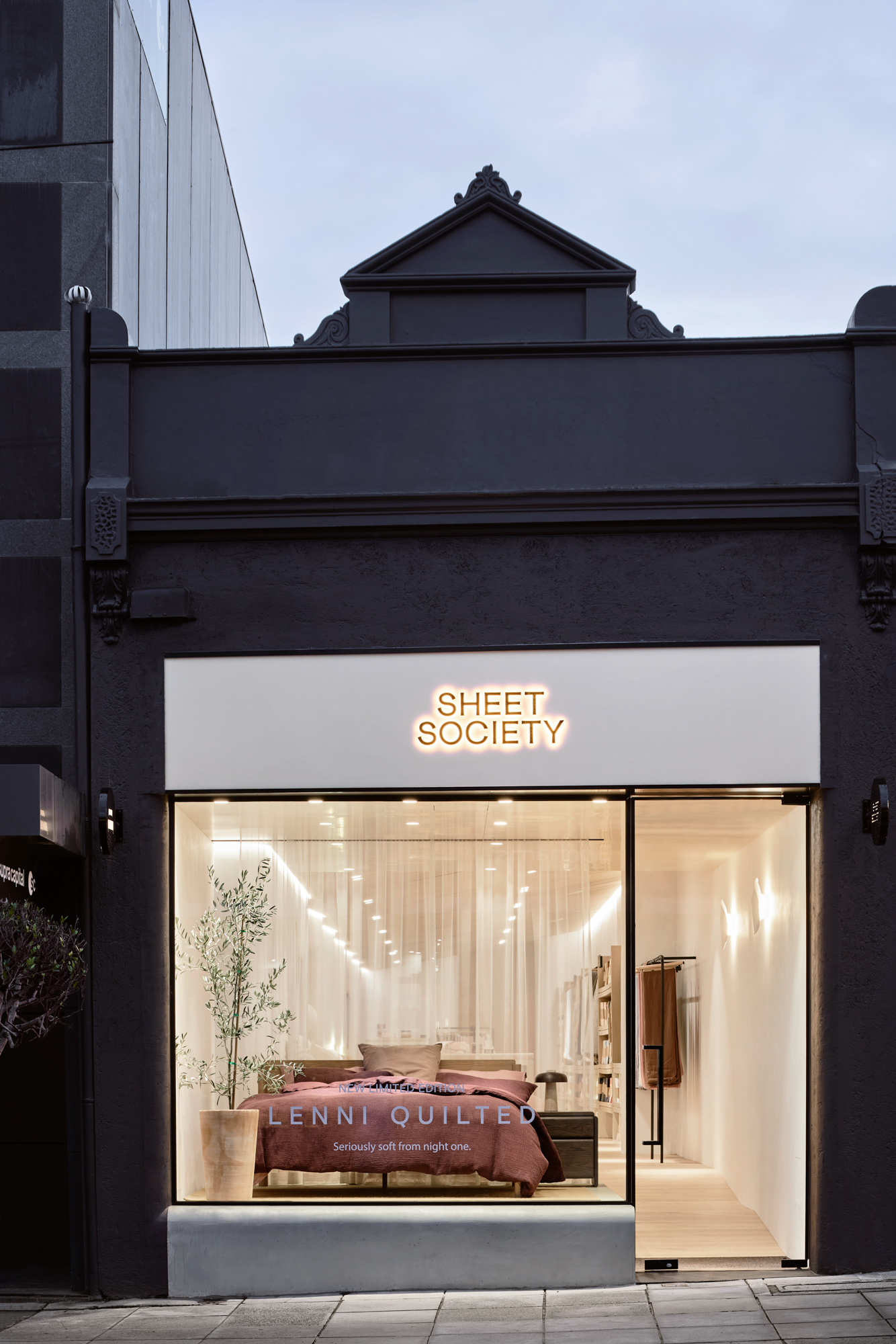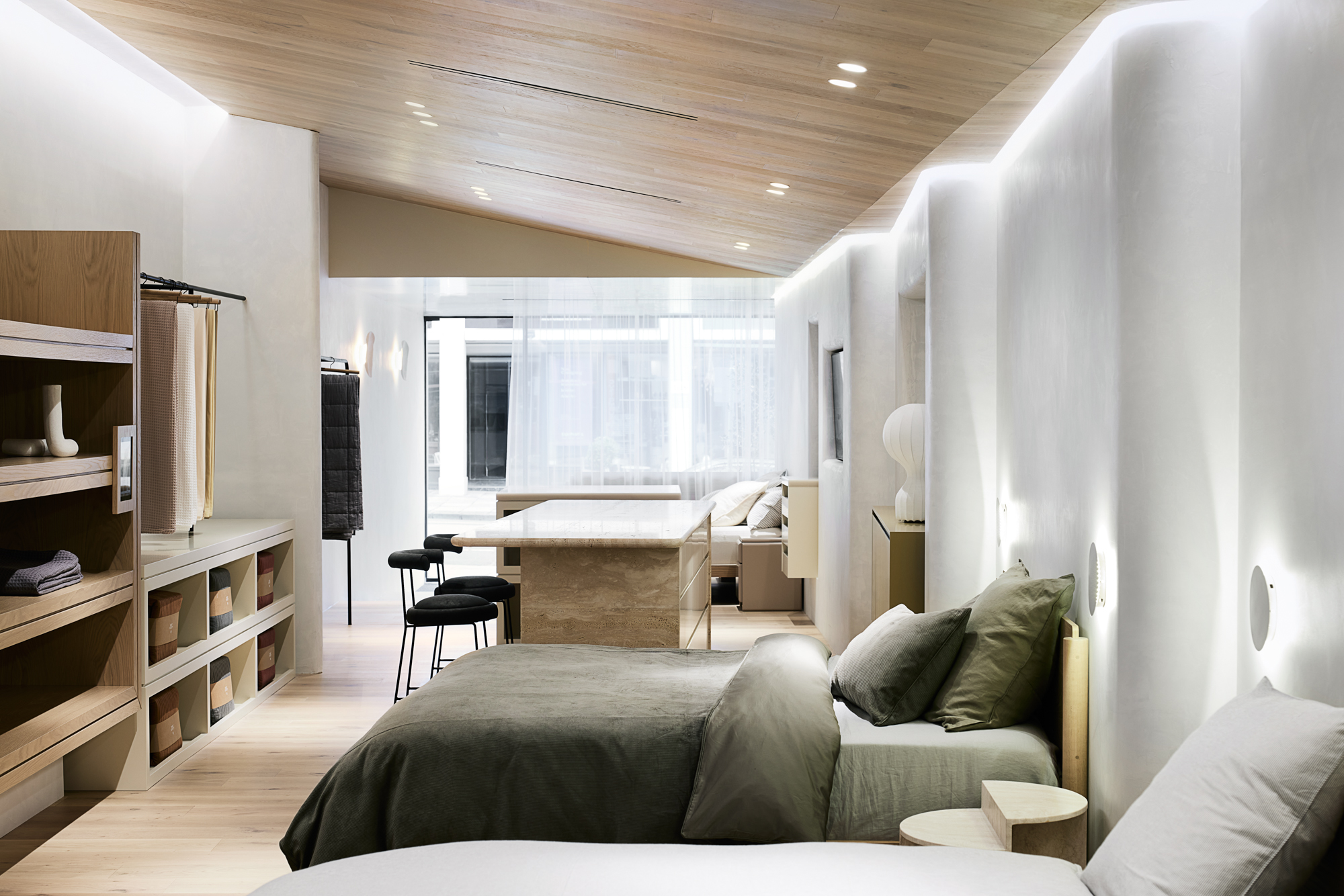Sheet Society’s Armadale store redefines sleep decor shopping as a sensory experience, guiding customers in creating their perfect bedroom sanctuary. The space features natural materials, soft curves, and raked timber ceilings, reflecting Sheet Society’s ethos of creating inspiring, restful environments.
